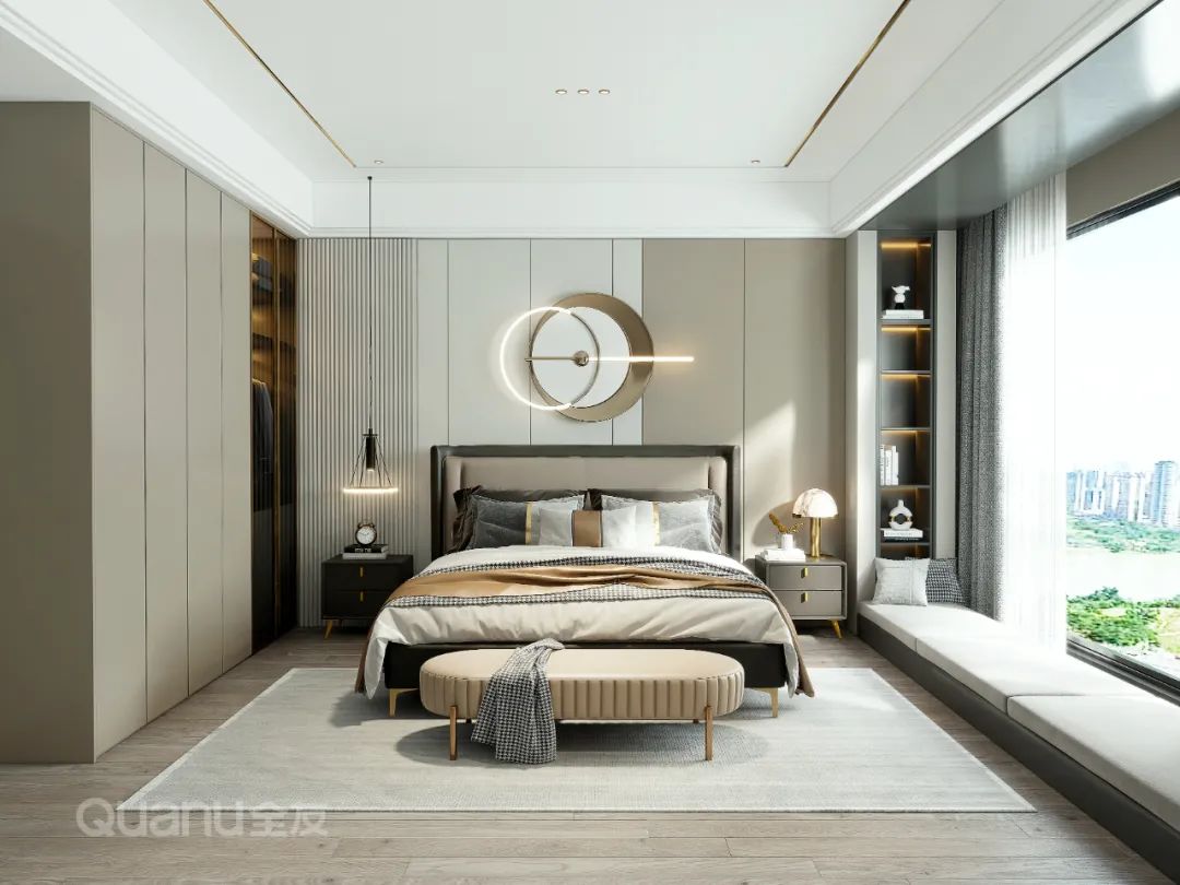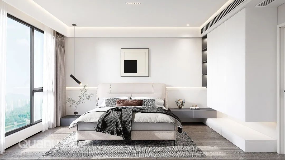 Trọng tâm của thiết kế phòng ngủ sang trọng nhẹ nhàng là "sự tinh tế". Dựa trên phong cách đơn giản, loại bỏ tất cả những yếu tố trang trí phức tạp, thường chọn các gam màu cao cấp như đen, trắng và xám để lát toàn bộ phòng ngủ để nâng cao khí chất của không gian, sau đó đến các chi tiết khác sử dụng vật liệu da, kim loại, đá cẩm thạch,... để điểm tô thêm sự tinh tế và trang nhã giúp chủ nhà tận hưởng một cuộc sống chất lượng cao.