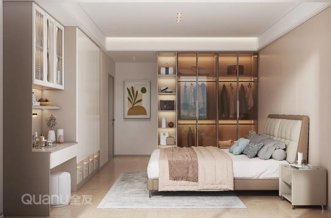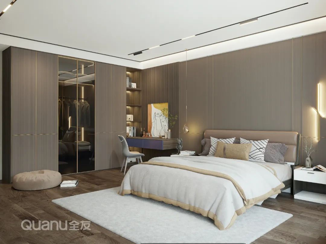 Thiết kế phòng ngủ đòi hỏi sự thoải mái và phong cách là điều không thể thiếu trong cuộc sống, và phong cách Ý là hình thức thể hiện thích hợp nhất cho cuộc sống chất lượng. Bức tường ở đầu giường hay nguồn sáng tích hợp trong tủ quần áo góp phần làm giảm bớt cảm giác buồn tẻ do màu cà phê mang lại; sự phối hợp giữa kính và ô lưới không chỉ phác thảo vẻ đẹp ảo và thực, mà còn hòa quyện giữa nét đẹp nhẹ nhàng và nghệ thuật hiện đại.