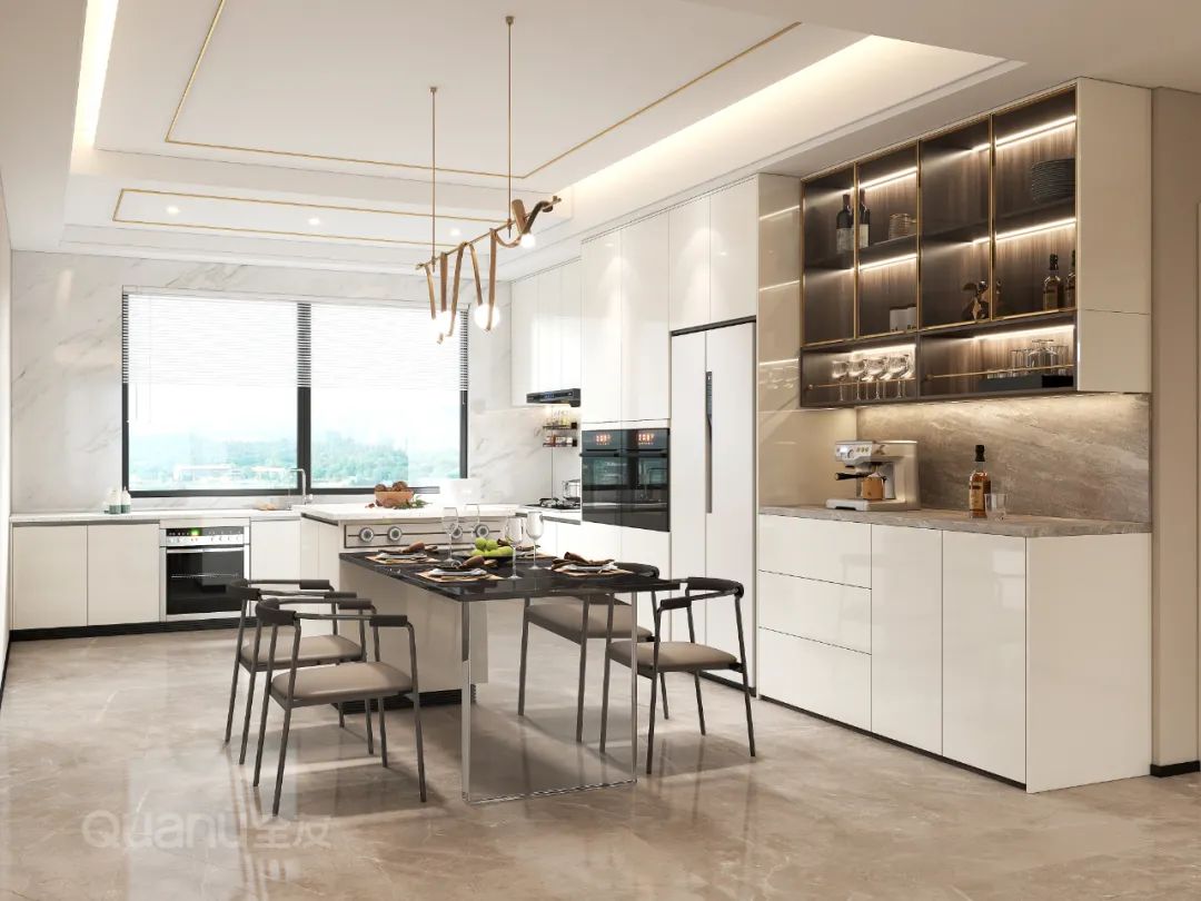 Chiếc tủ màu trắng mang lại cảm giác thanh lịch, gọn gàng và thoải mái cho khu vực nhà bếp, đồng thời thiết kế tay cầm cầm giúp không gian trở nên tối giản hơn. Thiết kế phòng bếp mở giúp cải thiện ánh sáng và tăng độ thoáng cho không gian.