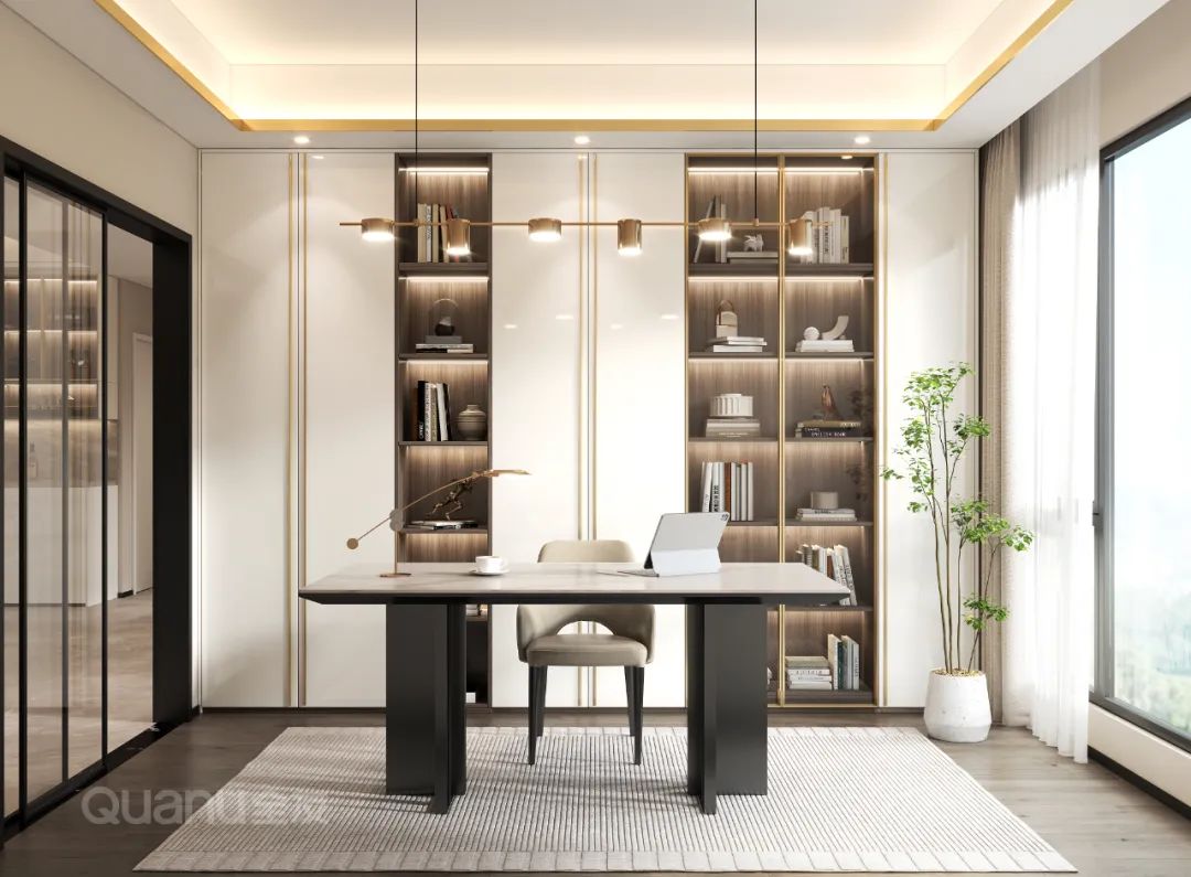 Trong phòng làm việc, toàn bộ tủ sách được thiết kế âm tường với sự “va chạm” của kim loại và kính đã tạo hiện một khí chất rất nghệ thuật và sang trọng. Dải ánh sáng được thiết kế trong tủ làm tăng cảm giác thời trang, hiện đại.