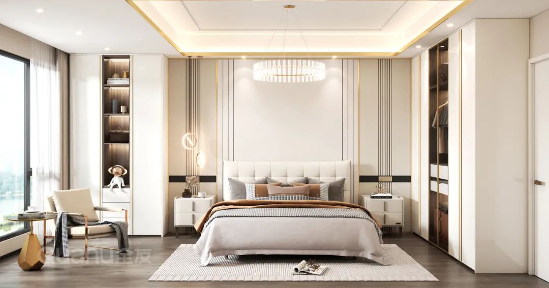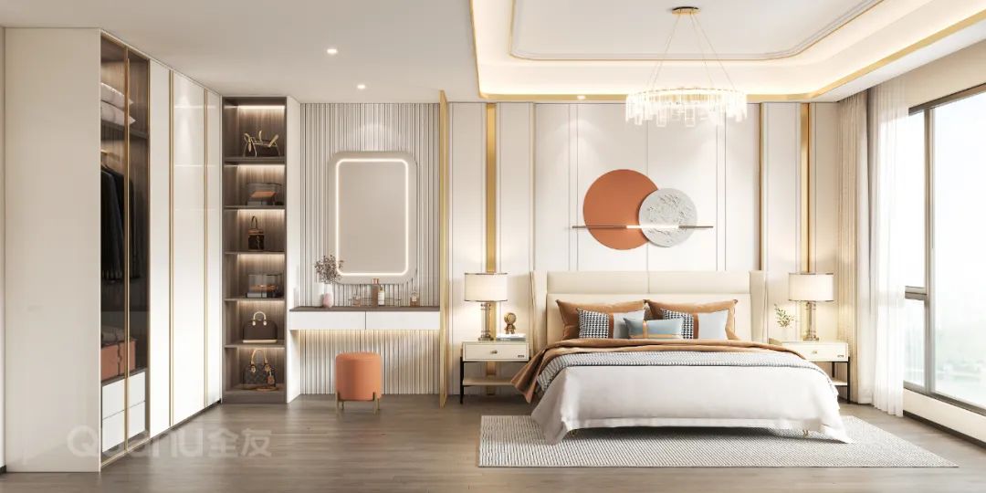 Tủ quần áo được thiết kế hình chữ L nối liền với góc đặt bàn trang điểm tạo ra khu vực thay đồ đẹp. Tường đầu giường được tô điểm thêm bởi các đường kim loại, kết hợp với ánh sáng và trang trí hình học mang lại cảm giác tinh tế, nhẹ nhàng, tạo ra một không gian ngủ trang nhã và ấm áp.