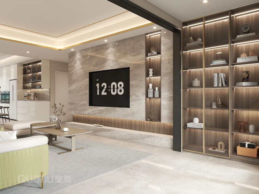 Vách lưới kết hợp với đá cẩm thạch để trang trí tường TV vừa hiện đại lại sang trọng