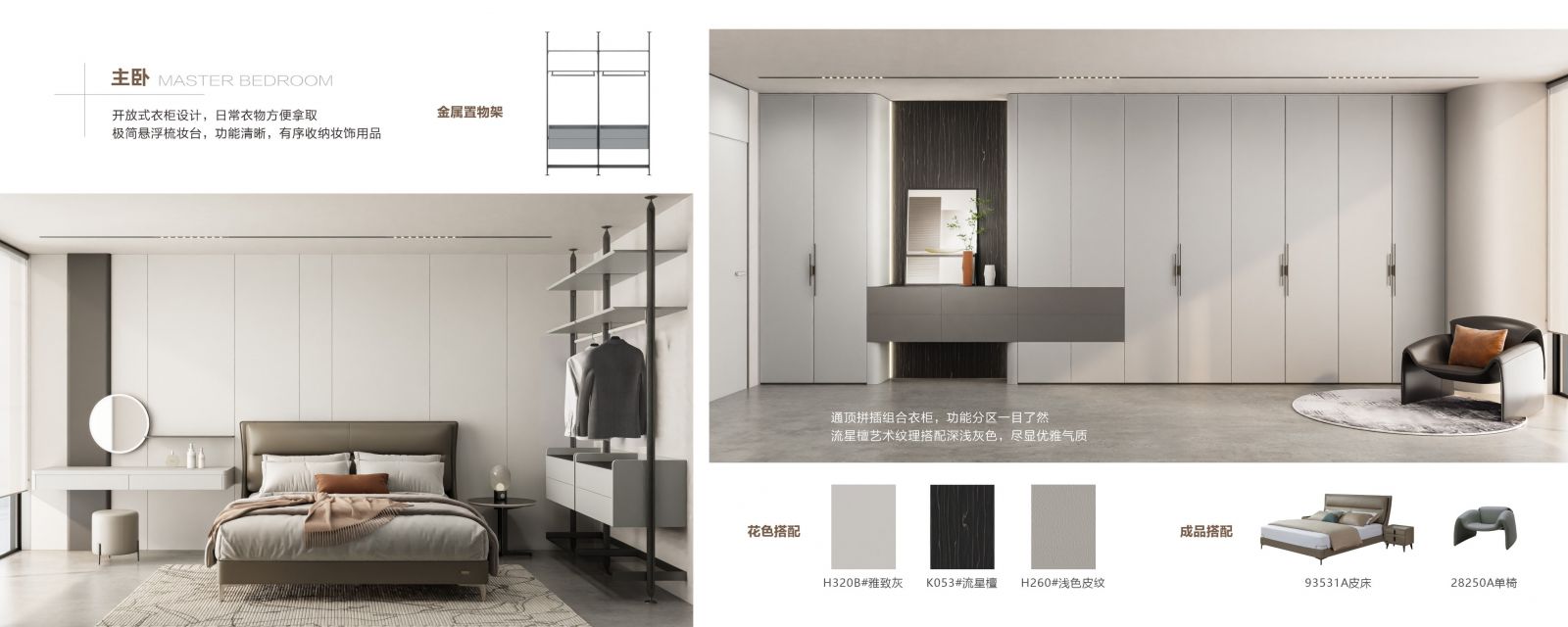 Thiết kế giá treo quần áo mở dễ dàng lấy quần áo hằng ngày. Bàn trang điểm treo tường tối giản và hiện đại. Tủ quần áo được thiết kế kết hợp thông minh, tạo 1 khoảng không gian trống ở giữa phân chia chức năng rõ ràng. Màu tối của gỗ đàn hương đan xen cùng màu xám nhạt và đậm mang đến cảm giác thanh lịch và sang trọng.