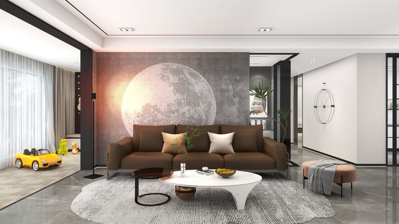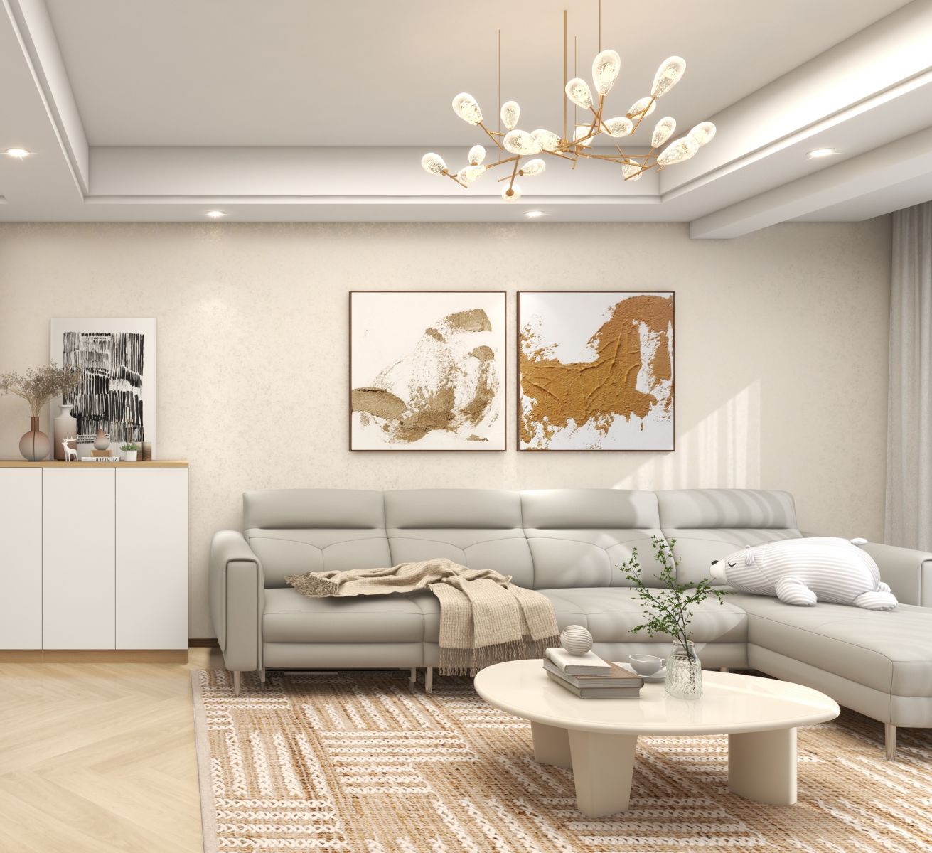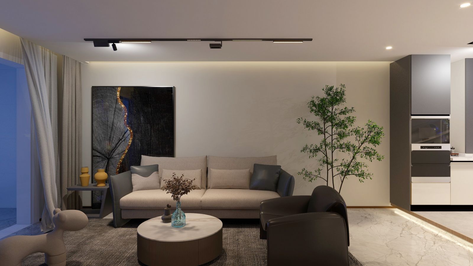 Nội thất phòng khách Quanu tối giản, hiện đại mà sang trọng, trang nhã. Kết hợp những đồ dùng nội thất như sofa, bàn trà, kệ tivi, tủ giày, đèn trần, lọ hoa, tranh treo tường,... phù hợp khiến không gian phòng khách đẹp mà tinh tế.