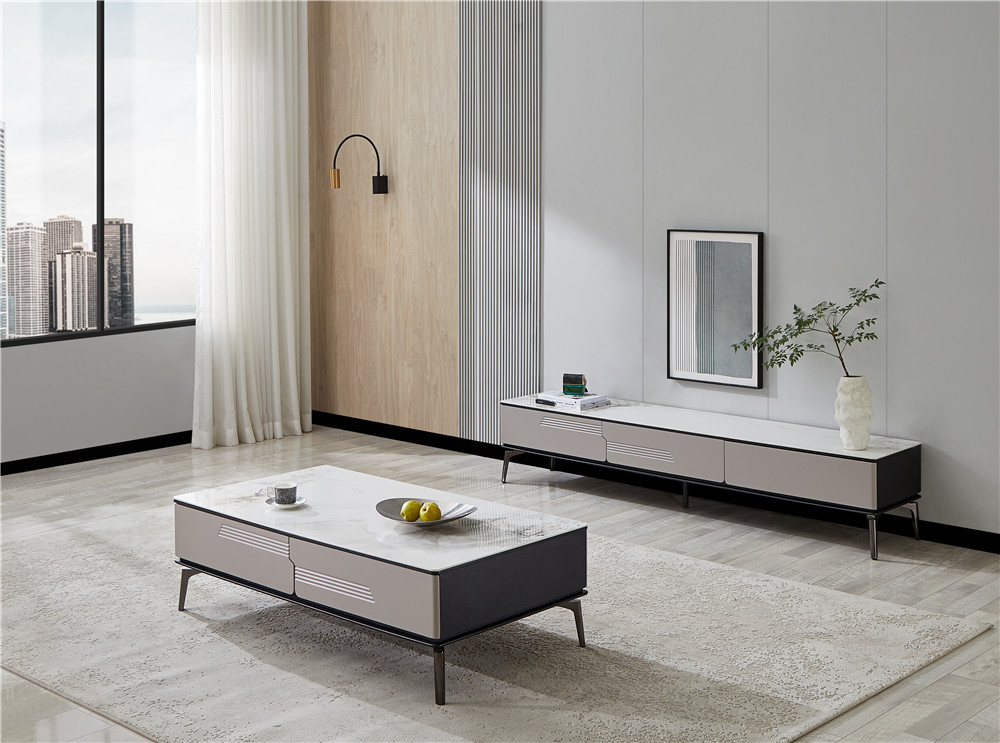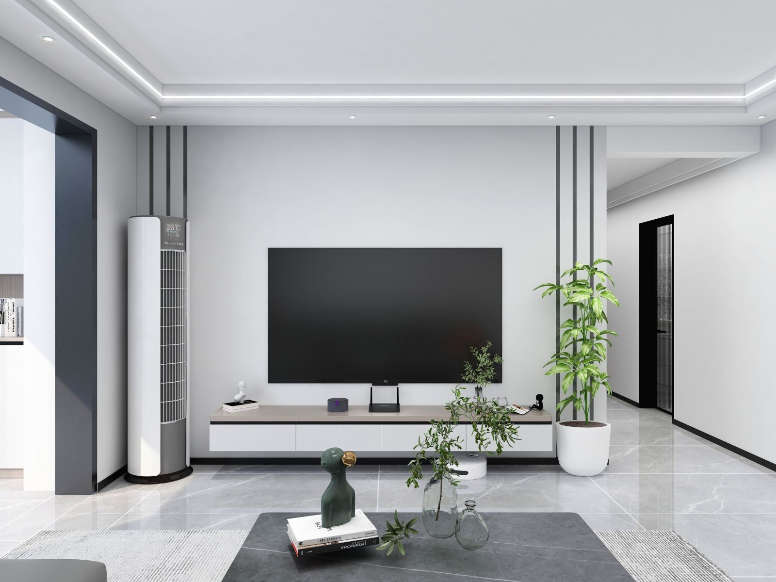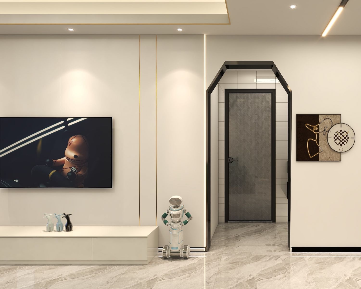 Nội thất phòng khách Quanu tối giản, hiện đại mà sang trọng, trang nhã. Kết hợp những đồ dùng nội thất như sofa, bàn trà, kệ tivi, tủ giày, đèn trần, lọ hoa, tranh treo tường,... phù hợp khiến không gian phòng khách đẹp mà tinh tế.